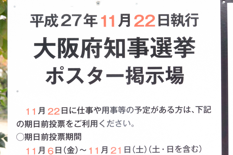 大阪府知事選挙2015(平成27年)立候補者・公式サイト一覧 投稿日 2015年11月7日 18:00 更新日 2021年3月31日 04:08 著者 すどん カテゴリー 話題 2015年11月5日に大阪府知事選挙が告示されました。 3名の立候補者と公式サイトなどを掲載しておきます。 候補者一覧(※掲載順は届出順です。)■ 栗原貴子(くりはら たかこ)自民党公式サイト■ 松井一郎(まつい いちろう)大阪維新の会 現職公式サイト■ 美馬幸則(みま ゆきのり)無所属ポスター・公式サイトは記事作成時点では見あたらず(見つかり次第追記します) 大阪府知事選挙の投票日は、11月22日(日)です。 期日前投票は、11月6日(金)~11月21日(土)です。 →期日前投票のやり方や場所についてはこちら ◆関連リンク選挙管理委員会事務局 枚方市役所 シェア ツイート LINE 大阪府知事選挙 選挙