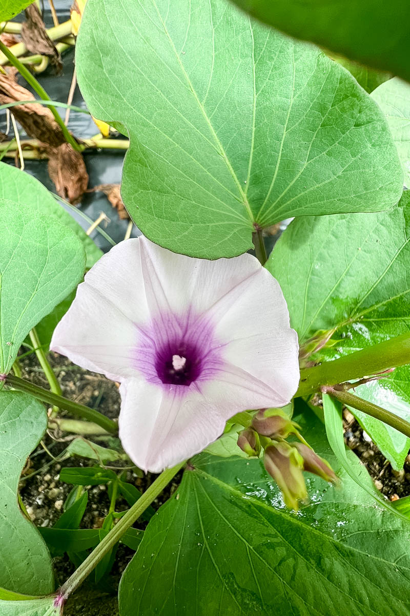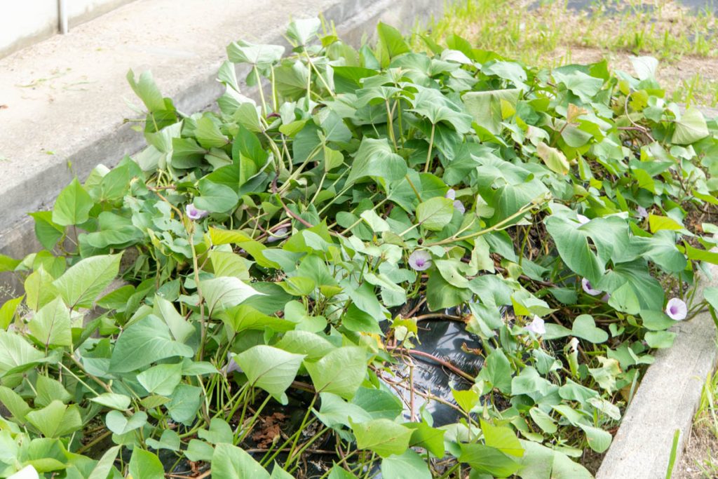 そもそもさつまいもの花は、日本では沖縄など九州地方以外ではあまり咲かないと言われているそうで、世界的には熱帯、亜熱帯の気候で花が咲きやすいのだとか。また、日照時間が短いにもかかわらず気温が高いときなどにも咲くようで、聞いていると枚方の気候と条件がぴったり。