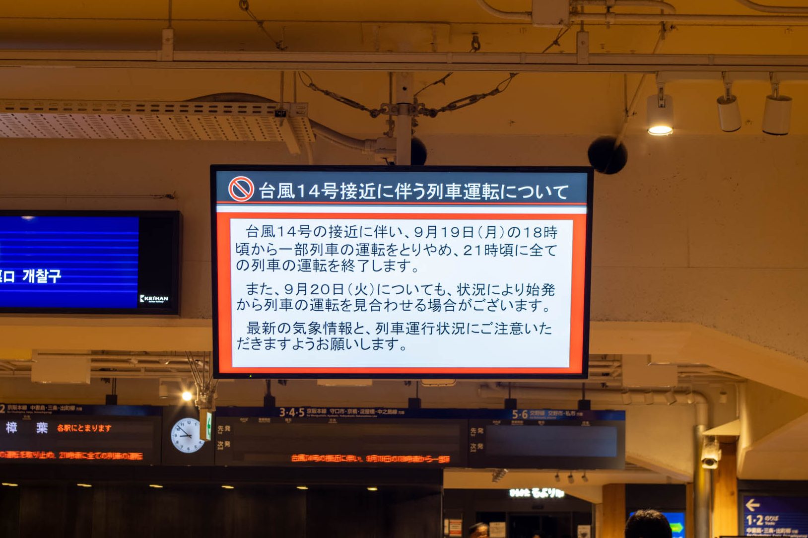 本日9月19日、京阪電車は台風14号の接近に伴い、21時頃にすべての列車の運転を終了するとのことでした。