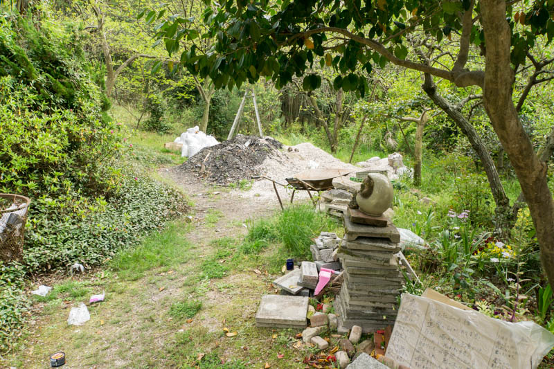 問題になった骨のようなものの山は奥のもの。墓石も山積みになっていました。