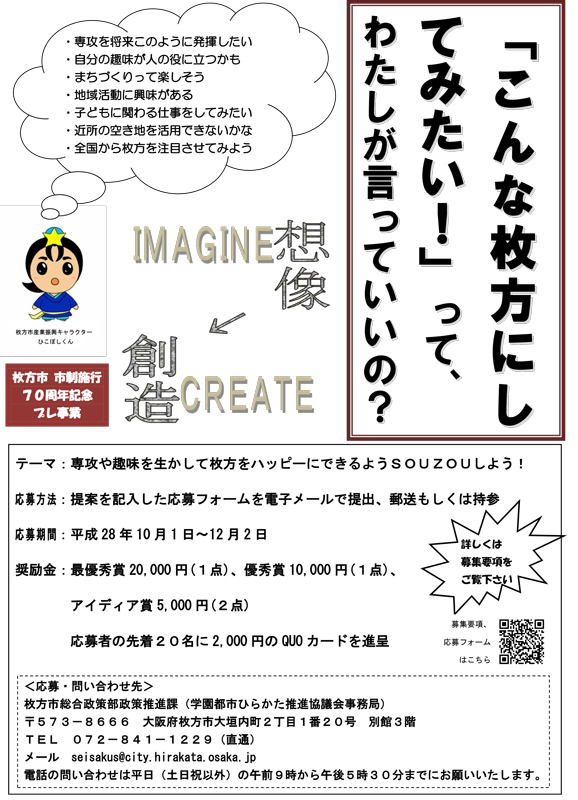あなた自身が「どのような枚方市にしたい」かを想像し、「どのように実現していく」かを創造し、提案してください。