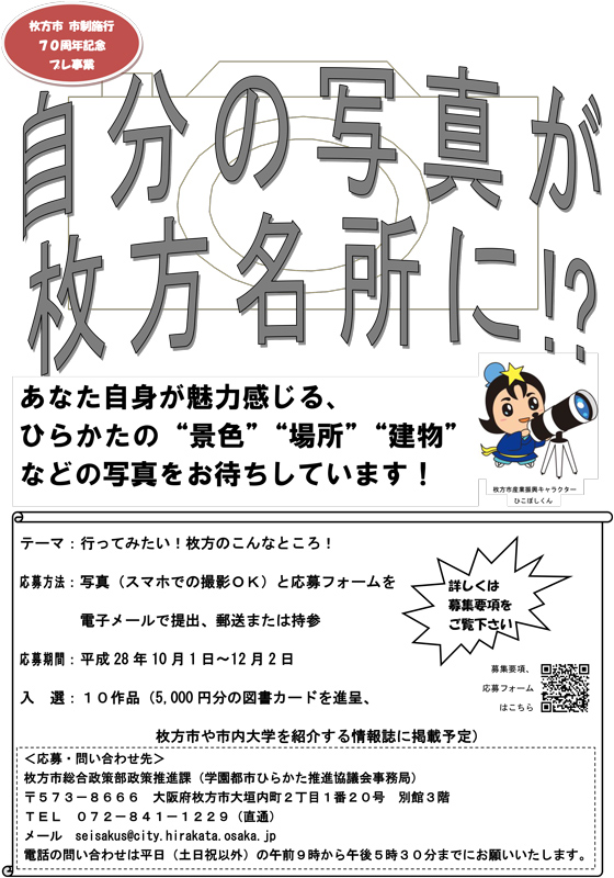 また、枚方市の概要や大学の紹介も盛り込んだ情報誌の作成を予定しており、入選した写真はそちらに掲載し市のPRに使用させていただきます。(情報誌は平成29年4月~5月に発行予定)