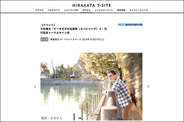 上記リンク先によると、七月隆文さんが「ケーキ王子の名推理(スペシャリテ)4」刊行記念として枚方T-SITEで7月27日にトーク&サイン会が行うとのこと。