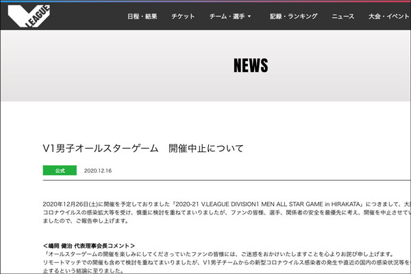 上記リンク先によりますと、12月26日に枚方市のパナソニックアリーナで開催予定だった「2020-21 V.LEAGUE DIVISION1 MEN ALL STAR GAME in HIRAKATA」は大阪府における新型コロナウイルスの感染拡大等を受け、開催を中止するとの記載が。