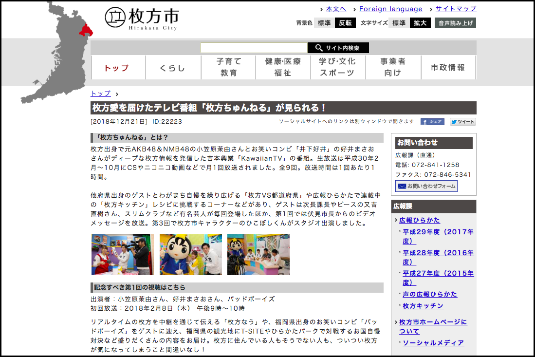 「枚方ちゅんねる」は元AKB48の小笠原茉由さんとお笑いコンビ井下好井の好井まさおさんの2人がMCを務めるトークバラエティ番組。CSやニコニコ動画などで、平成30年2月~10月にかけて全9回放送されました。