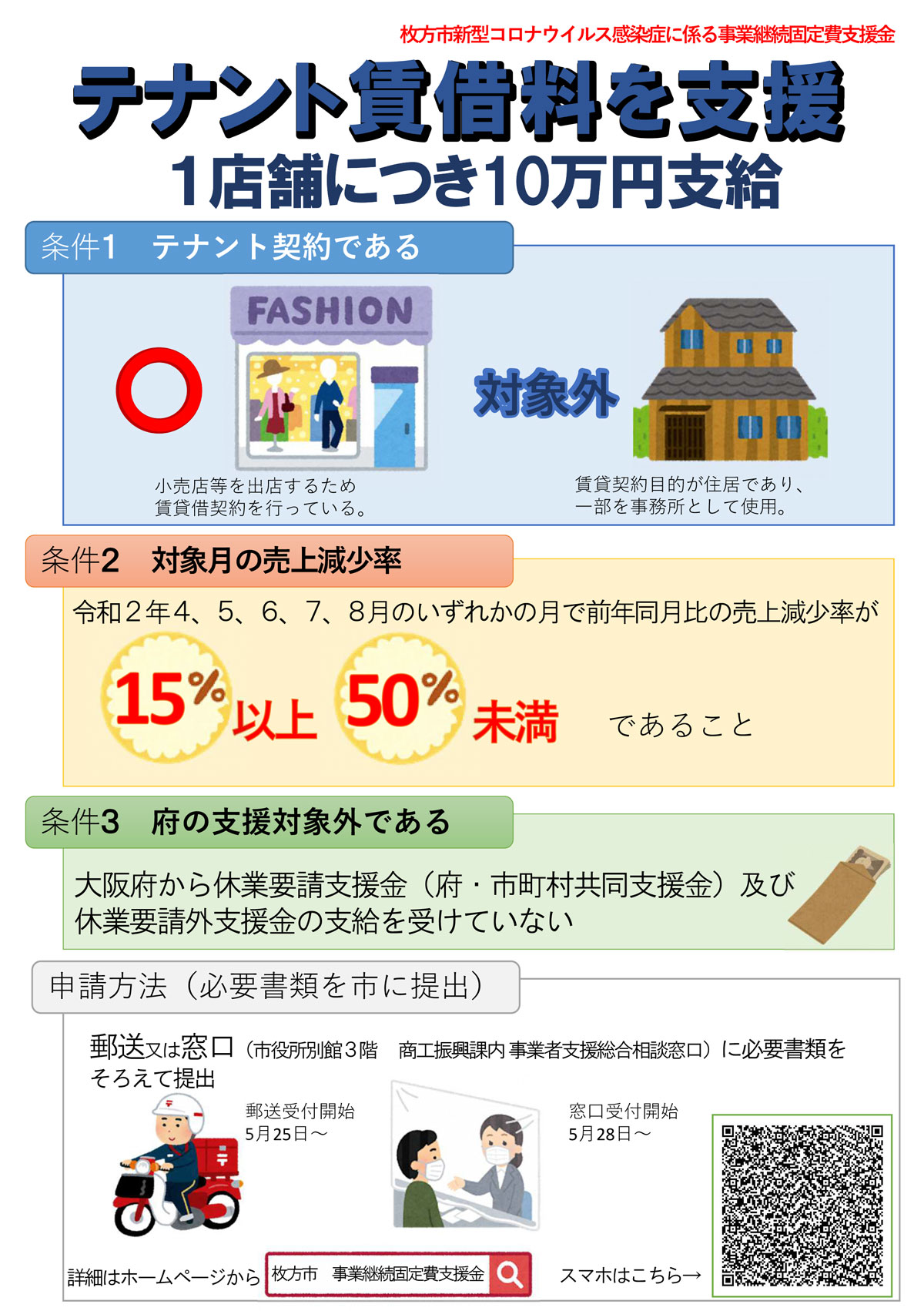 新型コロナウイルス感染症拡大により、特に影響を受ける中小企業・個人事業主のうち、大阪府の支援金の対象にならない事業者に対して、家賃等固定費を支援し事業継続を下支えするものです。