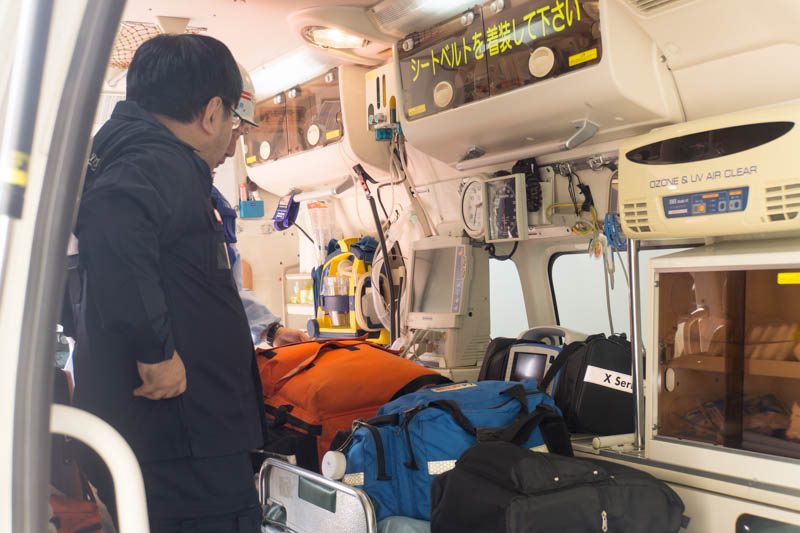 外観上では普通の救急車にステッカーが貼られただけの変化ですが、これは枚方寝屋川消防組合の各消防署の救急車をドクターカーとしてローテーションで回すために、あえて簡易なものになっているんだそう。救急隊員の練度をあげるためのローテーション制度とのこと。