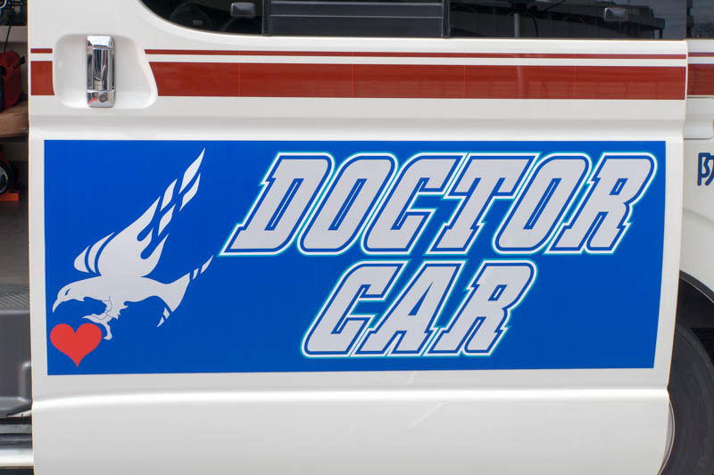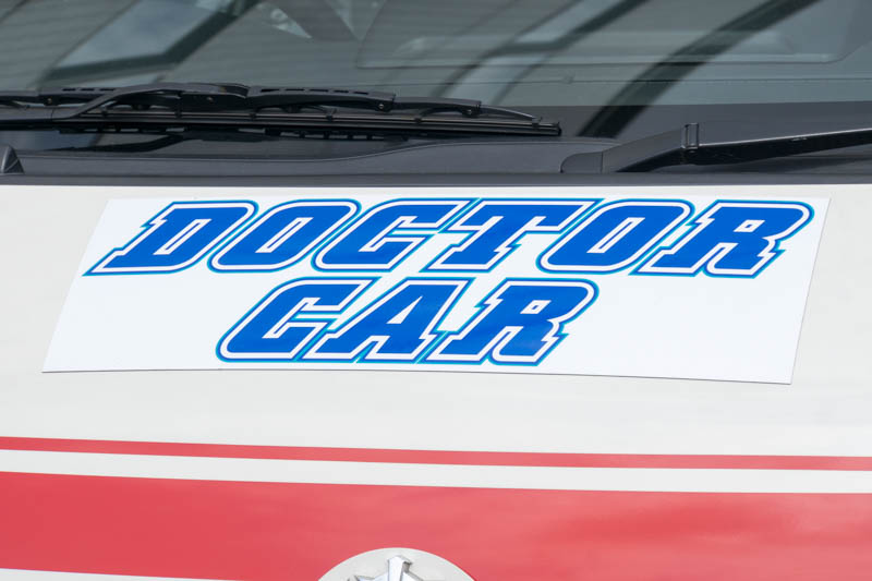 見た目は普通の救急車ですが、車の正面には「ドクターカー」のステッカー。