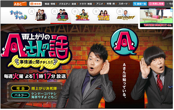 雨上がりの『Aさんの話』〜事情通に聞きました!〜とは、様々な分野で精通する事情通の方や関係者の方に裏事情や知らないことを教えてもらうという、お笑いコンビ「雨上がり決死隊」が司会を務めるバラエティー番組。
