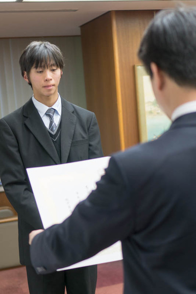 (国体優勝の東海大仰星の坂井宏和くんとJr五輪優勝の枚高の濱田澪くんへの市民スポーツ賞授与式のようすより濱田澪さん)