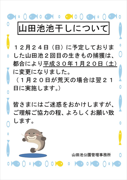 山田池公園にて予定されているテレビ東京「池の水ぜんぶ抜く大作戦」次回収録は1月20日になったようです。