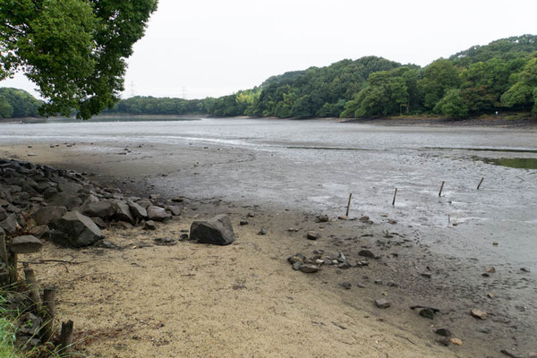 そのため山田池の東側はすっかり干上がって池の底が見放題状態に。