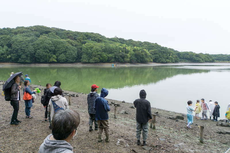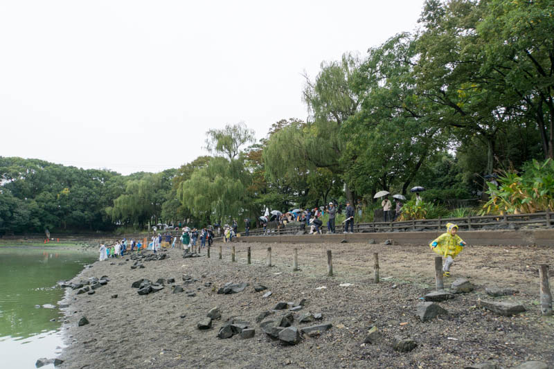 この時点での見物客の方々はこんな感じ。そもそも干上がっているとはいえ池の中に入ることができるという時点で僕はちょっとテンションがあがりました。