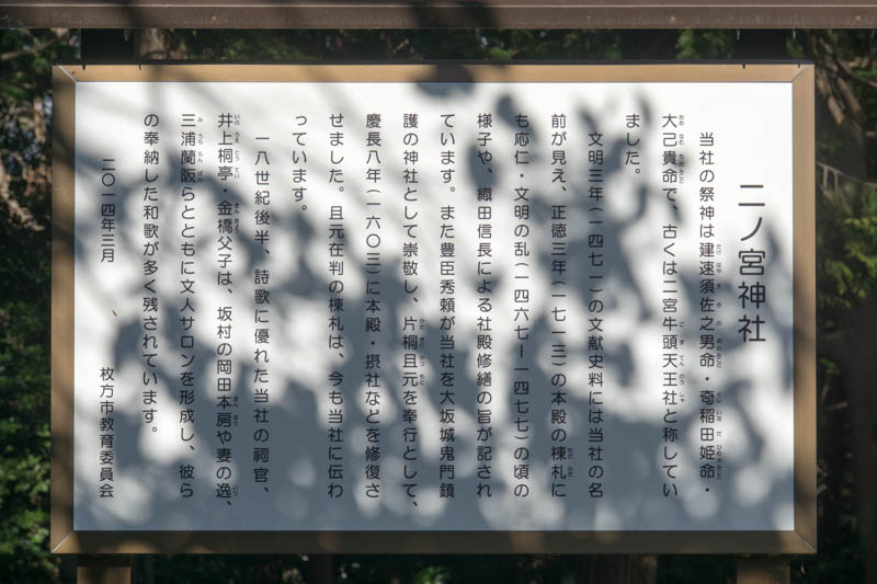 二ノ宮神社はくずはと牧野のあいだ、船橋本町にある神社。上記写真の看板のとおり、1471年以前からつづく由緒正しき神社です。