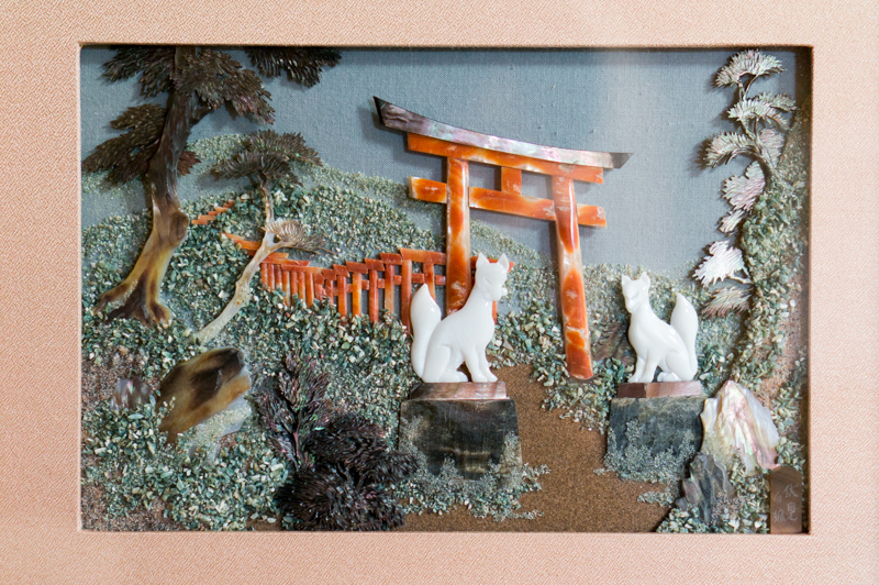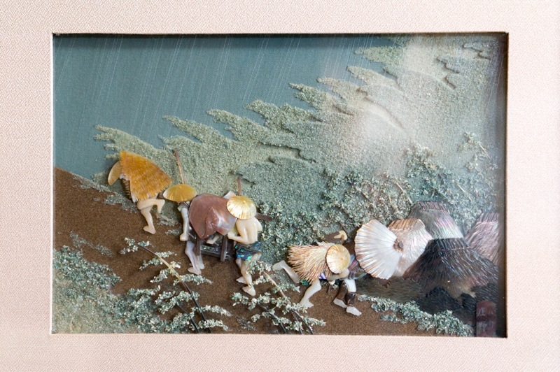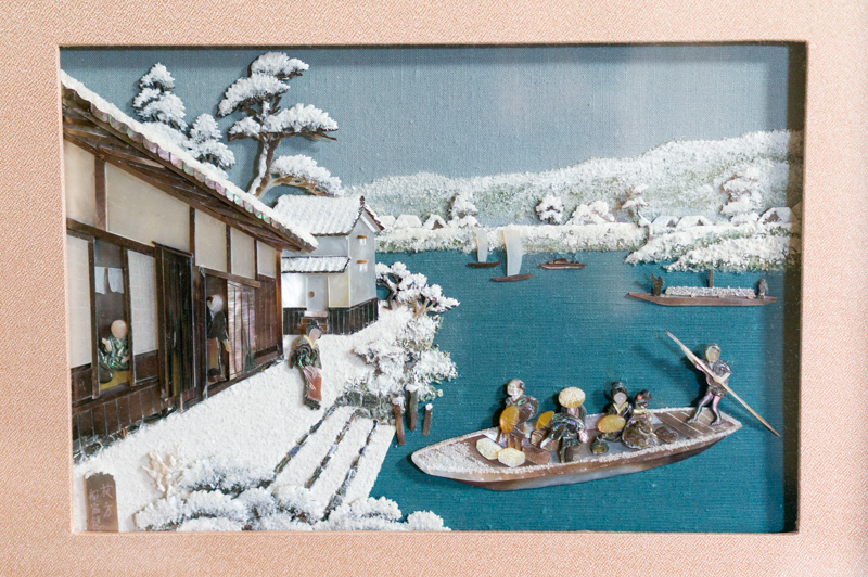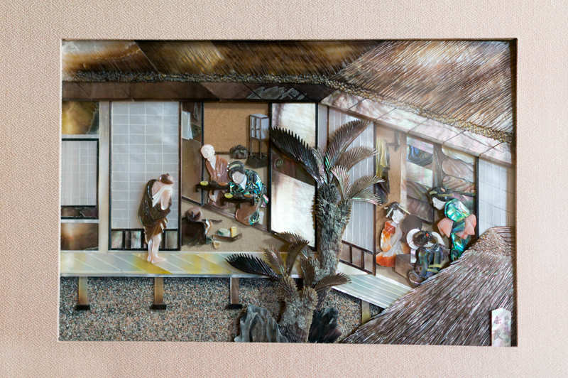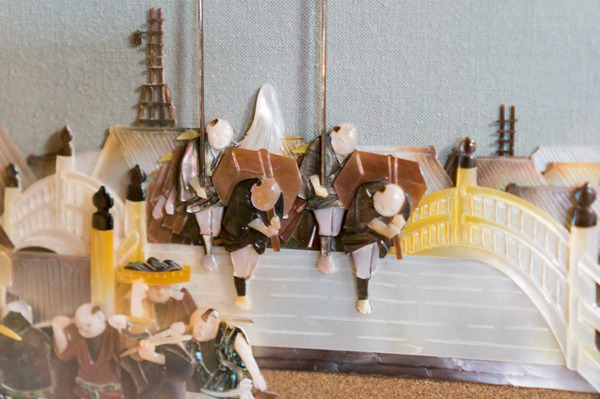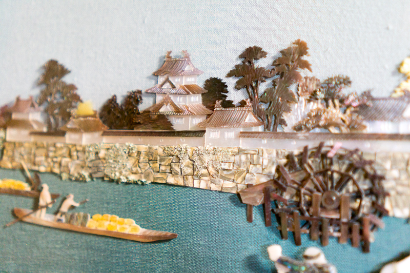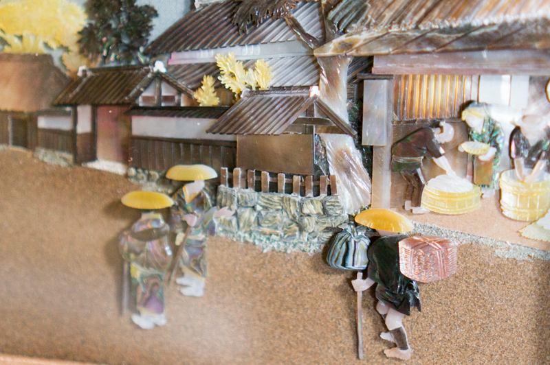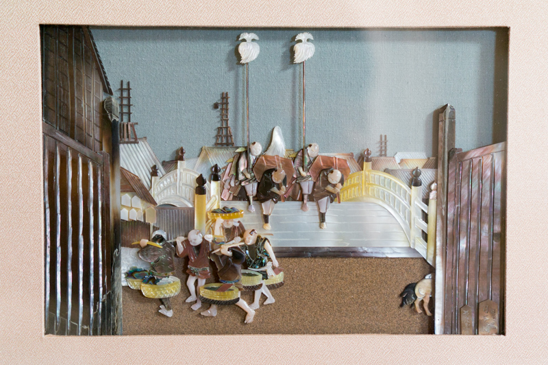 水田先生の代表作のひとつ「東海道五十七次」は、歌川広重の代表作「東海道五十三次」を貝工芸の作品として日本橋から作り始め、その流れを汲み「伏見宿」「淀宿」「枚方宿」「守口宿」と五十七番目の宿場町までを14年の歳月をかけて完成されました。