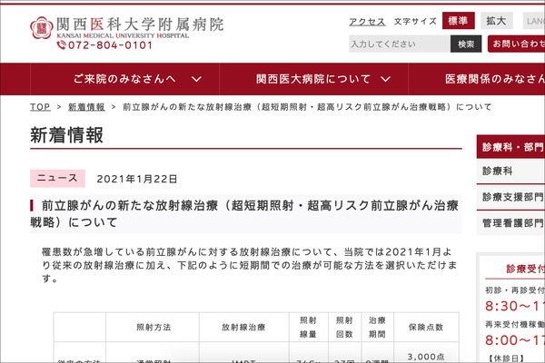 関西医科大学附属病院では、罹患数(一定期間に対象の人口集団から新たにがんと診断された数)が急増している前立腺がんにおいて、2021年1月より短期間での治療が可能となる新しい治療方法を選択できるようになったんだとか。