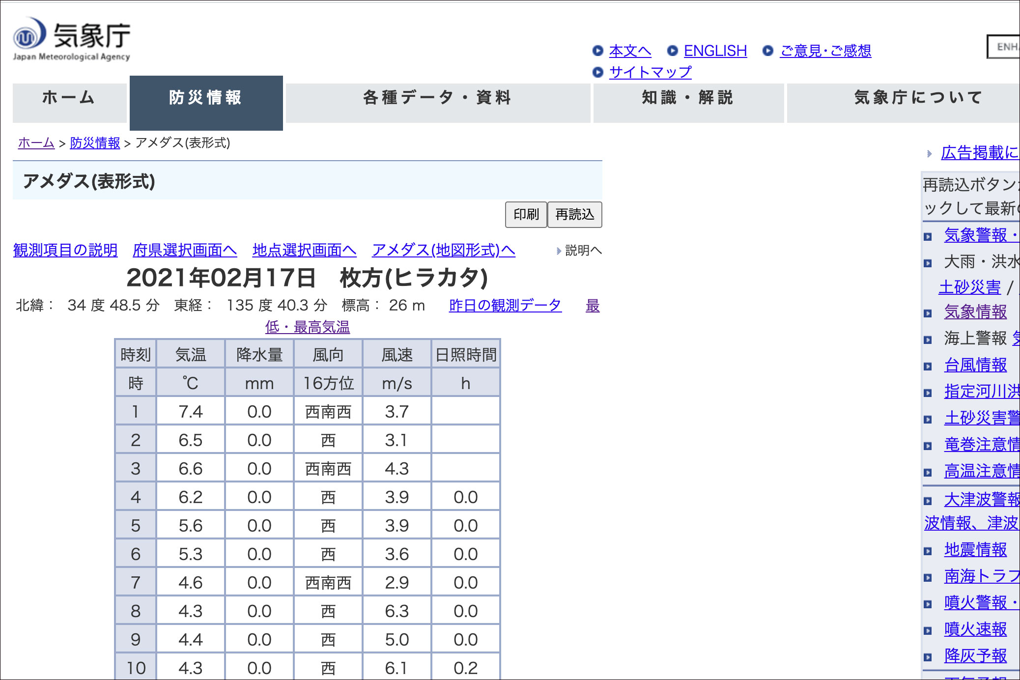 上記の気象庁からのお知らせによると、本日2月17日の枚方の最大瞬間風速(m/s)は11時14分の17.2m/sとのこと。