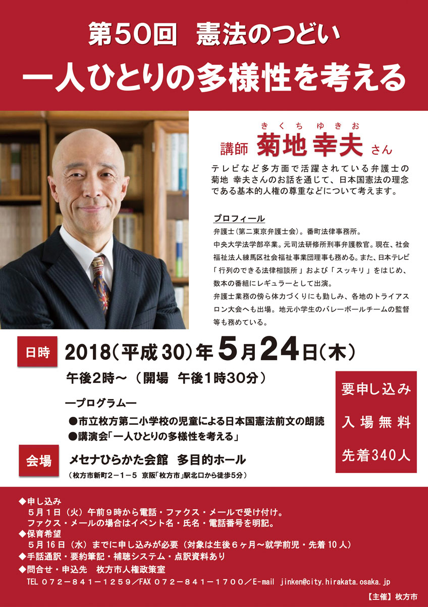 今回は第50回憲法のつどいというイベントに出演するために菊地幸夫弁護士が枚方にやってくるようで、イベントでは基本的人権の尊重などについて解説してくれる模様。