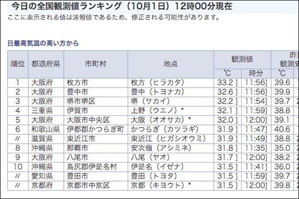 10月1日12時時点での日最高気温の高さで枚方が1位にランクインしています。