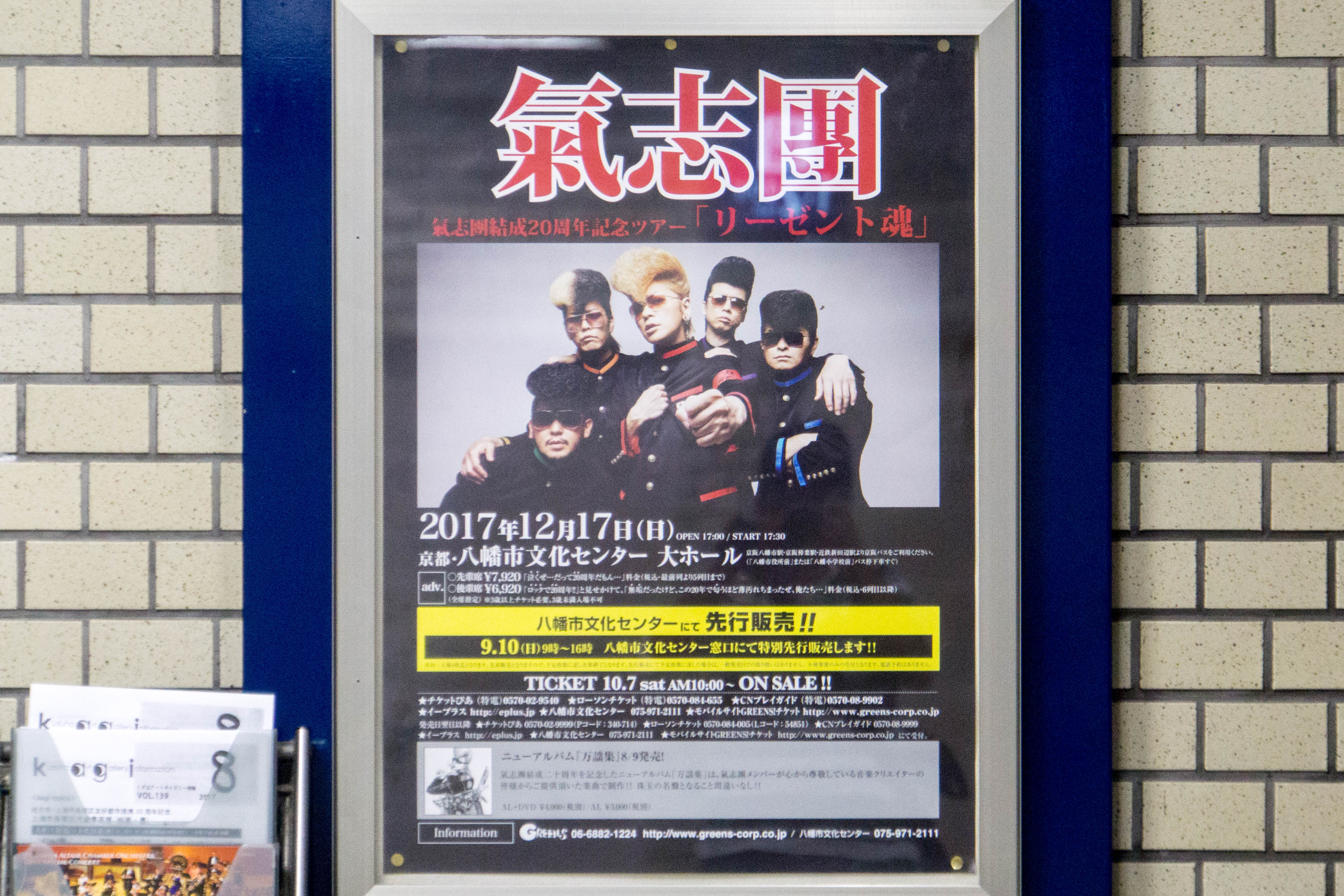 樟葉駅に貼ってあったこともあり、既にご存知の方もいらっしゃるかもしれませんが、リーゼントスタイルで人気の氣志團が20周年記念ツアーとして全国を回るようで、大阪会場がオリックス劇場に対して京都の会場は八幡市文化センターとなっている模様。(→公式サイト)