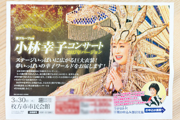 来年3月30日(木)、枚方市市民会館に小林幸子さんが来るようです。