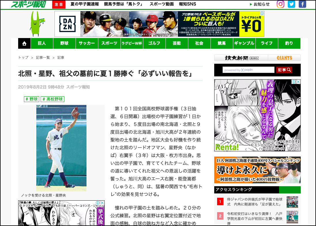 上記リンク先によると、南北海道の枠で甲子園へ出場する北照高校のレギュラーである星野央(なかば)選手(3年生)は枚方出身のようです。