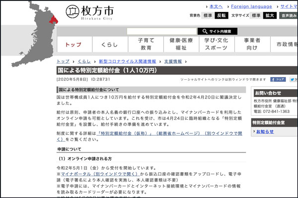 枚方市では5月1日よりオンライン申請ができるようになっています。