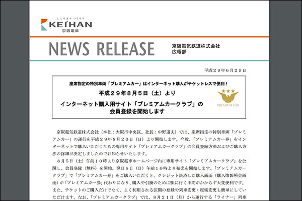 上記リンク先によると、プレミアムカーやライナー列車の搭乗券をネットで購入できるサイト「プレミアムカークラブ」の会員登録を8月5日よりはじめるとのこと。