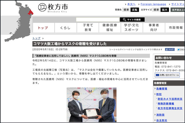 コマツ大阪工場からマスクの寄贈を受けました|枚方市役所公式サイト