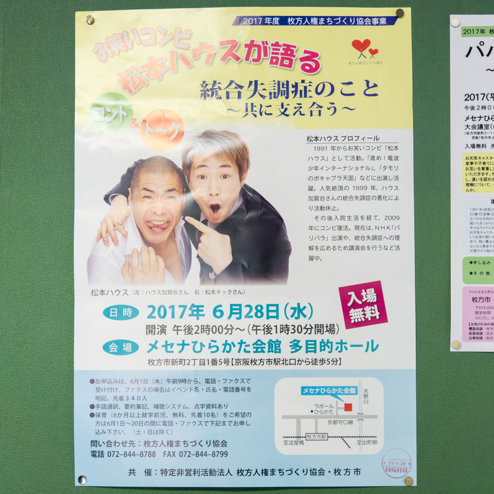 ポスターによると、講演会では自身の統合失調症についてのトークやコントなどを行う模様。