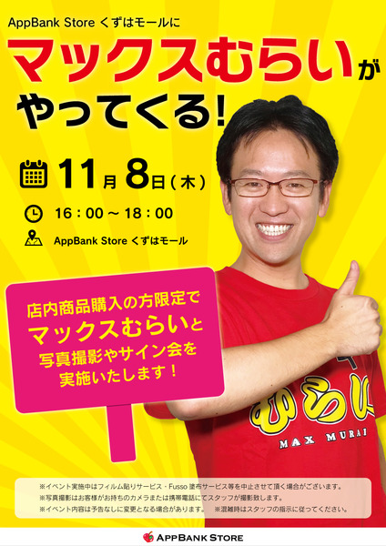 ※イベント中フィルム貼り等は中止させて頂く可能性がございます💦#くずはモール #マックスむらい #AppBank pic.twitter.com/VoxK7BOiF6— AppBank Store くずはモール (@abskuzuha) 2018年10月30日