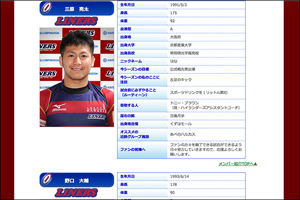 近鉄ライナーズは東大阪にホームを持つジャパンラグビートップリーグに所属するラグビーチームで、東大阪の地域情報サイトでは三原選手のインタビューなども掲載されています。