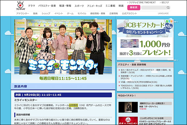 ミライ☆モンスターは将来有望なアスリートの卵に密着するドキュメンタリー番組。日曜の11時ごろに放送されていまして、5年前から放送されているのでご覧になったことがある方も多いのでは。(→Wikipedia)