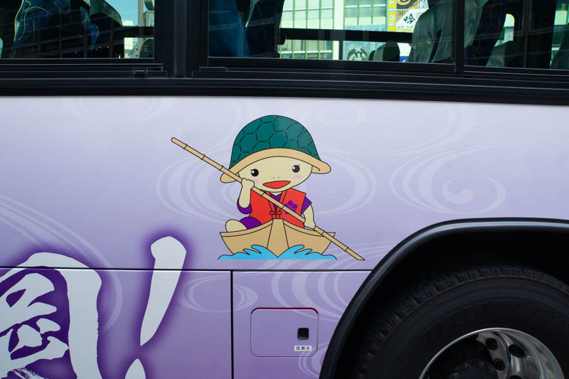 バス側面には明智かめまるくんという亀岡市のゆるキャラ、