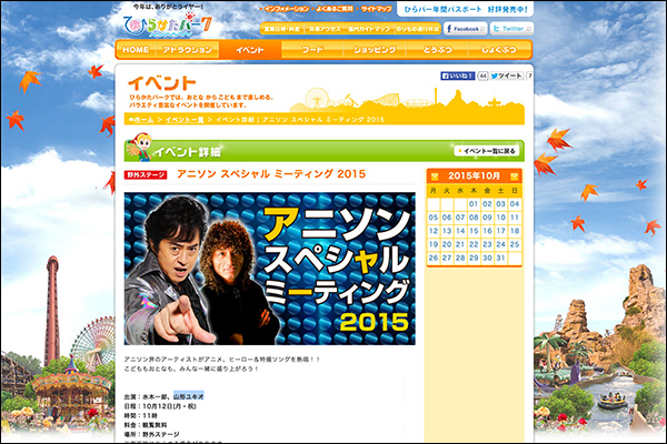 上記ページによりますと、ひらかたパークの野外ステージで10月12日に行われるイベント「アニソン スペシャル ミーティング 2015」に、アニソンの帝王「水木一郎」さんと「山形ユキオ」さんが来て、アニメ&ヒーロー&特撮ソングを熱唱するそうです。
