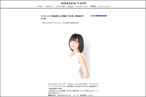 上記リンクによると5月5日の16:00から、中島由貴さんの1st写真集「ゆき恋」発売記念イベントが枚方T-SITEにて行われるようです。