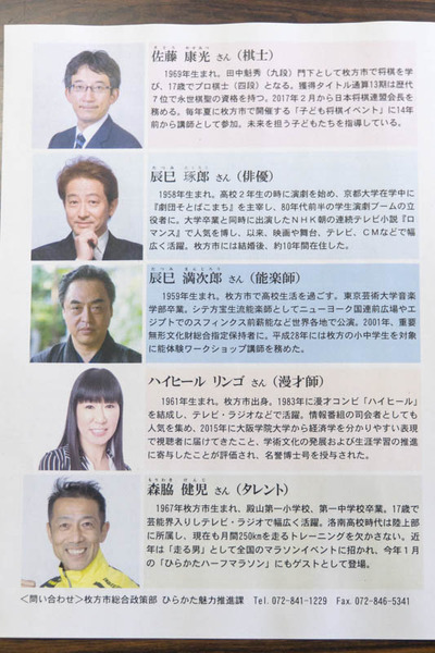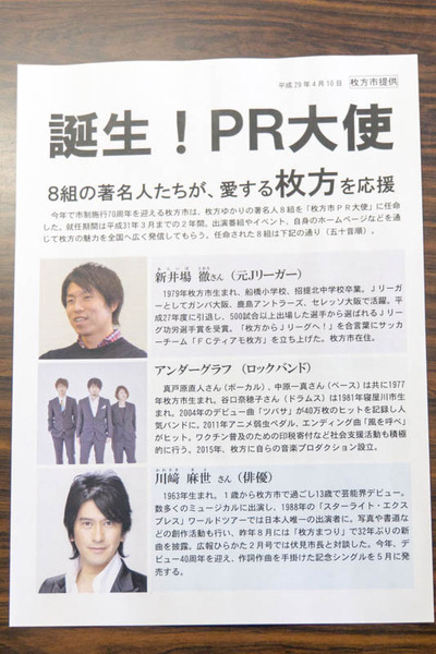 枚方に関係する著名人8組が平成31年3月までの2年間、枚方のPR大使に就任することになりました。