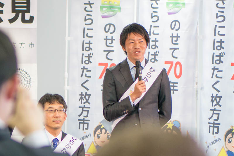 「枚方に帰ってきたら牧野から御殿山、枚方市駅あたりを走って、最後は高陵小の坂道をダッシュするというのが僕のコースです。枚方は生まれ育った街ですし、どんどんと元気になって貰って、すみやすい街になってほしいと思います。そのために僕が役に立てることがあればどんなことでも言ってほしい」とコメント。