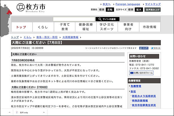 大雨にご注意ください【7月8日】 | 枚方市ホームページ