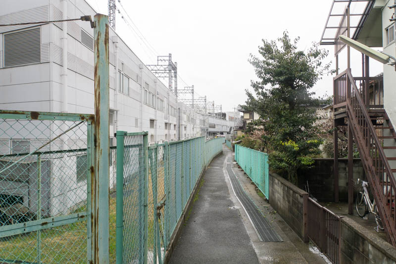 歩行者専用通路に関しては現状ではどこどことは言いづらいですが、この団地側から京阪本線と交野線のあいだにはいり、前述の外周道路へと抜けていく歩行者用の道、と考えておくといいんじゃないでしょうか。