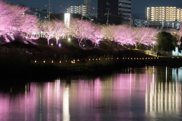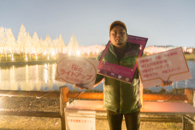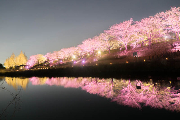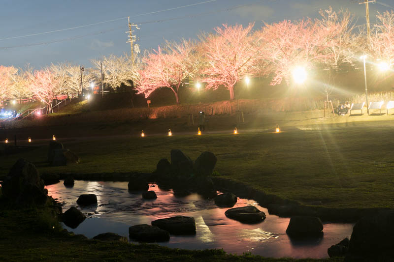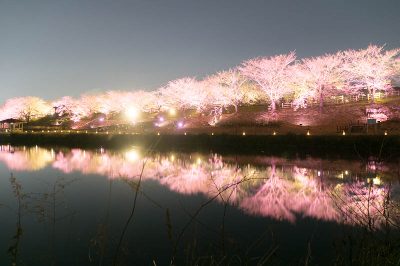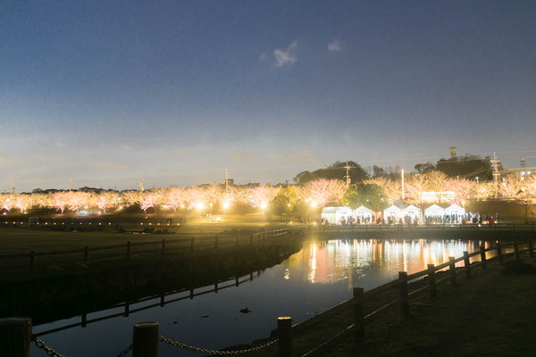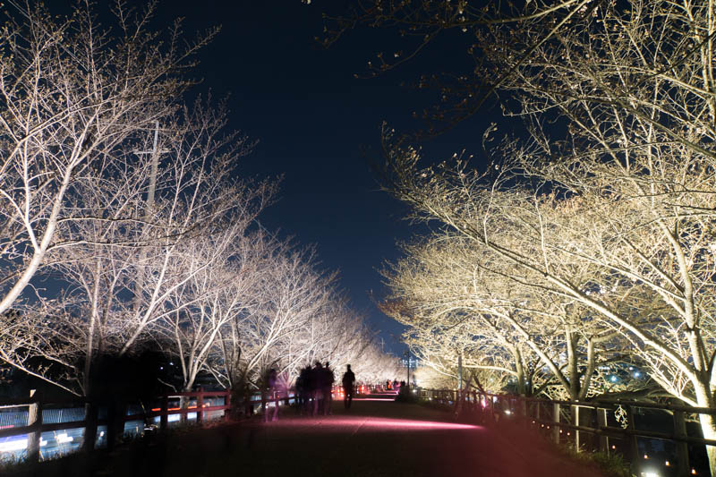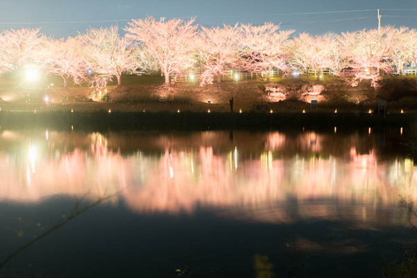 さっきからたくさん載せている写真は、桜のライトアップ並木道から川や池をはさんだ向こう側からの写真。