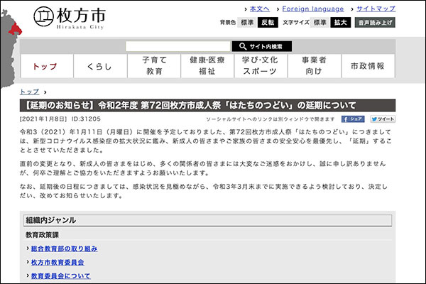 上記リンク先によると、1月11日に開催を予定だった枚方市成人祭「はたちのつどい」が延期されることになったようです。各中学校で開かれるものも全て。