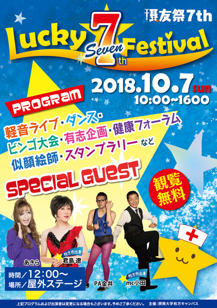 寝屋川キャンパスは10月6〜8日の三連休全てで学園祭が行われるようで、7日には厚切りジェイソンさんによる特別講演会、8日にはゴールデンボンバーによるスペシャルライブが開催されるとのこと。
