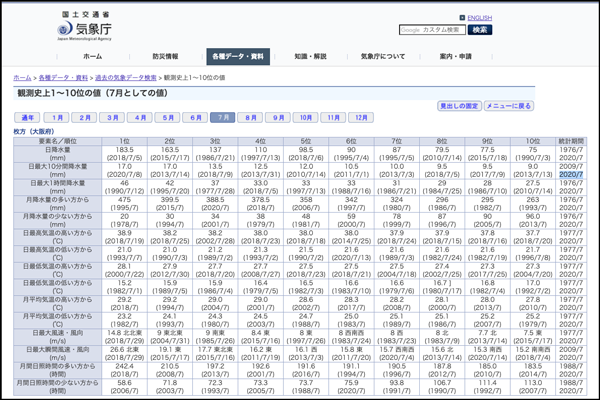 上記リンク先を見てみると、以前にも記事にした7月8日の「日最大10分間降水量」1位を筆頭に、他の項目でも今年の7月がランクインしています。