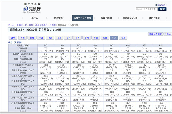 上記リンク先の「日最高気温の高い方から」を見ると、11月19日の26.8℃が11月の記録としては観測史上1位となっています。こちらは記事にもしています。