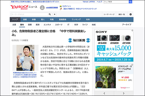 小6、危険物取扱者乙種全類に合格 「中学で理科実験楽しみ」(毎日新聞) – Yahoo!ニュース