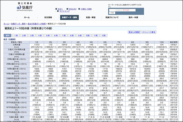 上記リンク下部のところを見てもらうと、「日最大瞬間風速・風向」のところの1位の記録『22.5 北 (2017/10/23)』と記載されているのがわかります。