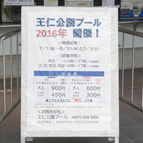 王仁公園のページに詳細が掲載されていて、それによると今夏の営業は本日から8月31日、9月3日までとなっている模様。