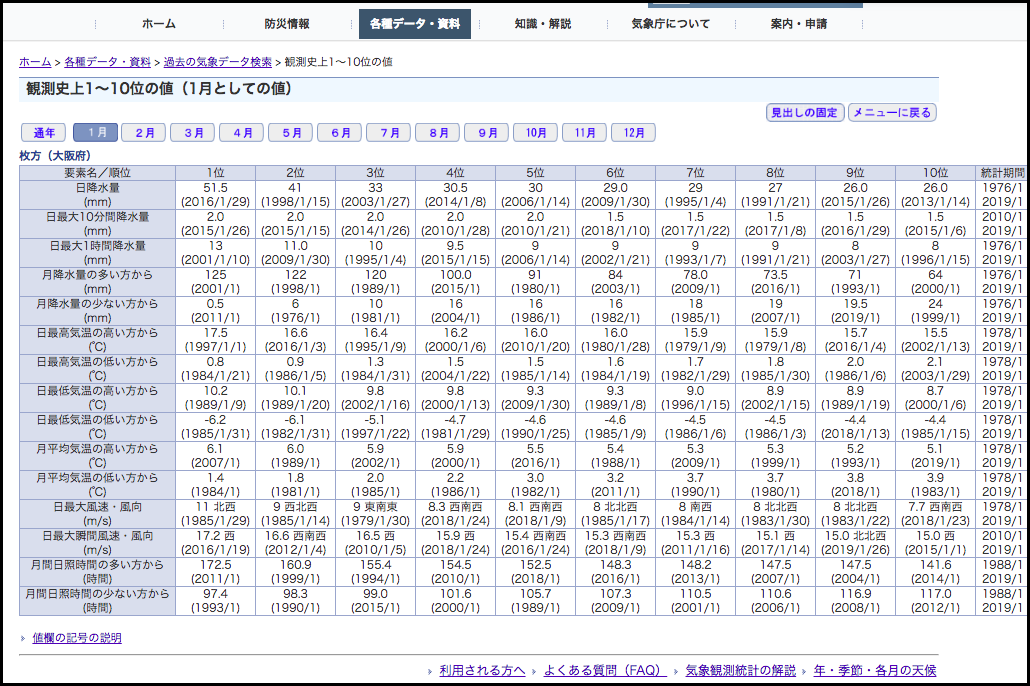 上記リンク先の月降水量の少ない方からと「月平均気温の高い方から」と「日最大瞬間風速・風向」のところを見ると、2019年1月がそれぞれ9位と10位と9位(風速は1月26日)にランクインしていることがわかります。