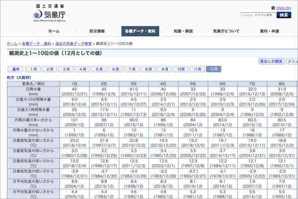 一昨年2018年の12月の平均気温は8.3℃だったので、比べるとほんの少し下がりましたが5位と高めです。